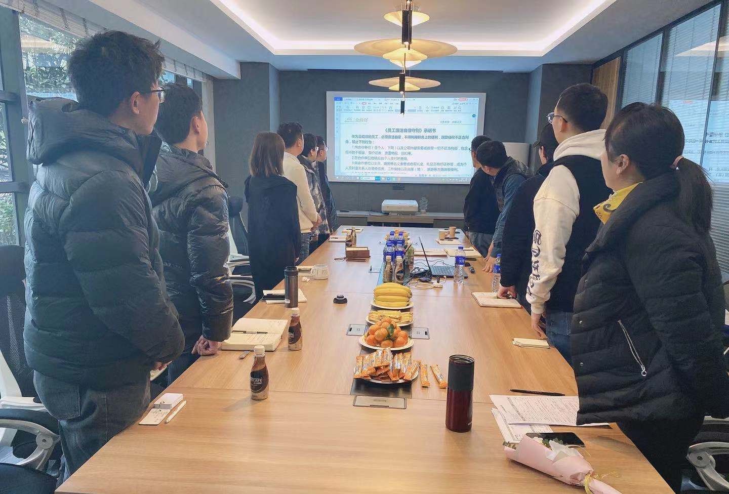 公司副總裁劉麗麗總參加會(huì)議。會(huì)上,劉總首先對(duì)新員工的加入表示誠摯歡迎,并傳達(dá)楊總對(duì)新員工的關(guān)懷及期望,隨后向大家介紹了公司組織架構(gòu)、職業(yè)晉升通道、管理方向與要求等內(nèi)容。決算審計(jì)部孫勇將五力五意識(shí)及對(duì)標(biāo)管理模塊詳細(xì)地向大家進(jìn)行宣導(dǎo)與解讀,希望通過自己的感悟和理解,結(jié)合實(shí)際工作中的案例向大家講授,讓全員更感同身受及踐行。在劉總的帶領(lǐng)下,全員整齊莊嚴(yán)地宣讀了《金螳螂自律宣言》,希望大家在以后的工作中能堅(jiān)守誠信服務(wù)意識(shí)與廉潔自律的初心。