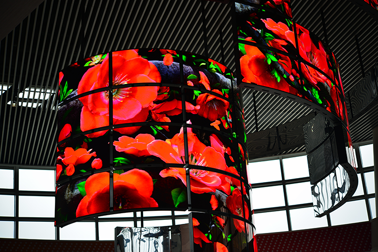 觸屏異形顯示屏由12塊55寸屏無縫拼接,應用4:4:4顏色無損同步顯示技術及強大的后臺發布管理功能,實現海量4K視頻視頻同步播放。