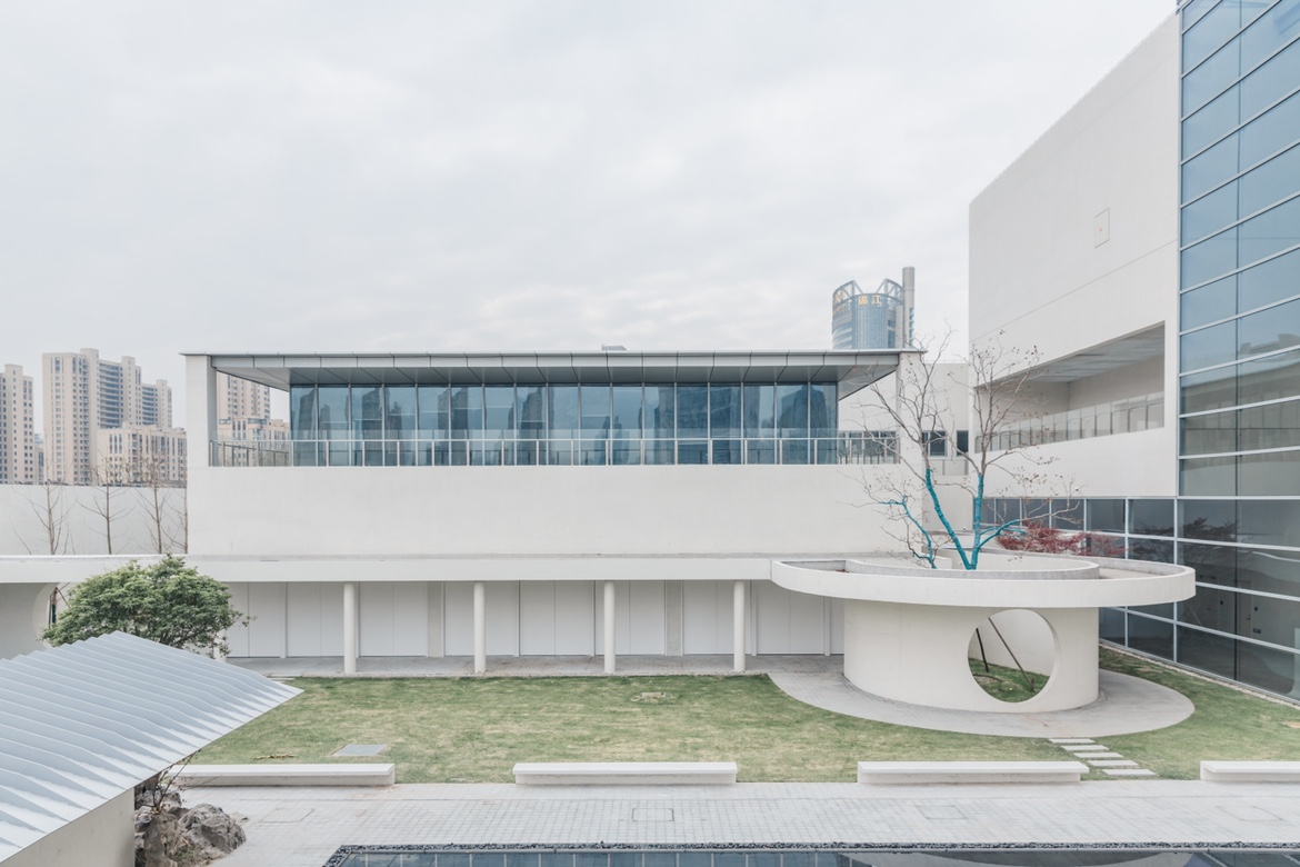 太倉(cāng)美術(shù)館建筑采用大面積白色清水混凝土,混凝土獨(dú)特的厚重感和雕塑感還原了婁東畫派濃墨山水的意境,蘊(yùn)含著“婁東一脈,山水傳神”的象征意義。