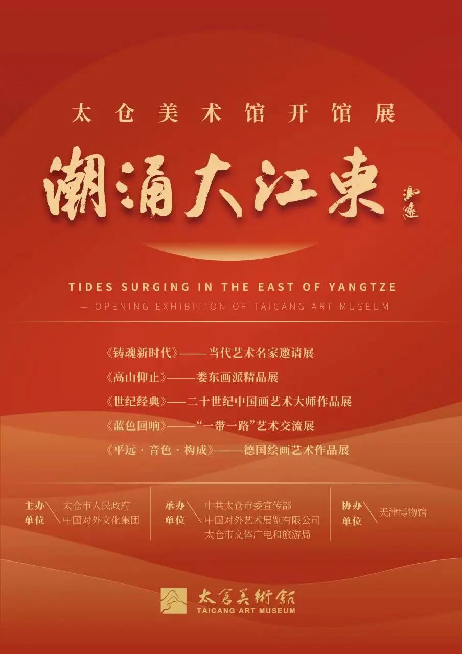 “潮涌大江東——太倉美術館開館展”由太倉市人民政府和中國對外文化集團共同主辦,共分為5個單元,分別是“鑄魂新時代——當代藝術名家邀請展”“高山仰止——婁東畫派精品展”“世紀經典——二十世紀中國畫藝術大師作品展”“藍色回響——‘一帶一路’藝術交流展”“平遠?音色?構成——德國繪畫藝術作品展”。